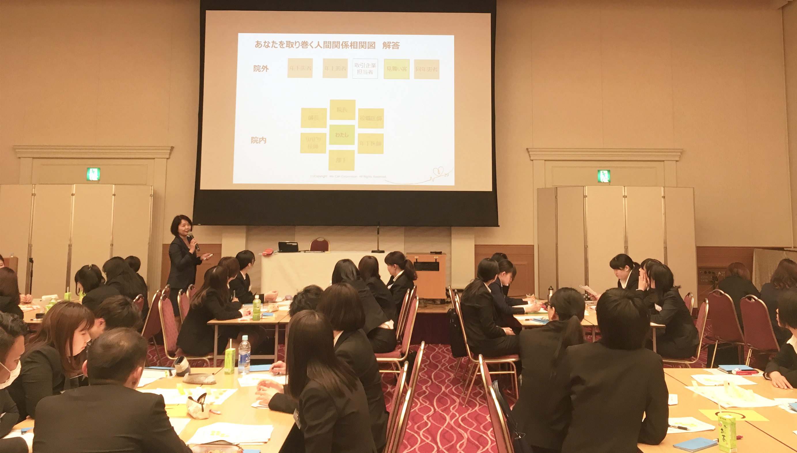 外部講師による研修では、心構えやマナー、患者・利用者・家族への応対など、基本的社会人としてのスキルを習得することを目的としています。