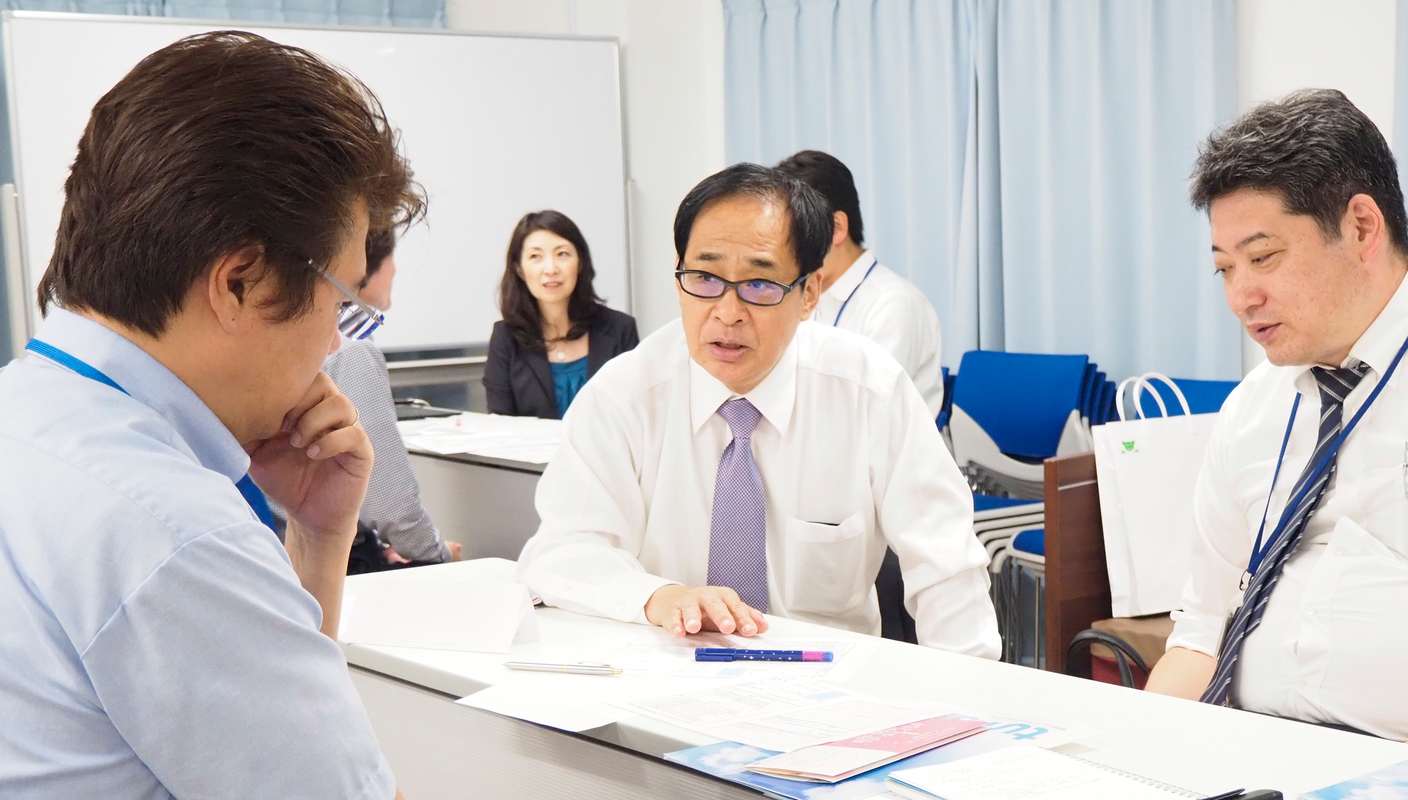 研修の場で、同期の仲間と情報共有をしながら、今後の仕事に対する姿勢や目標を再確認します。