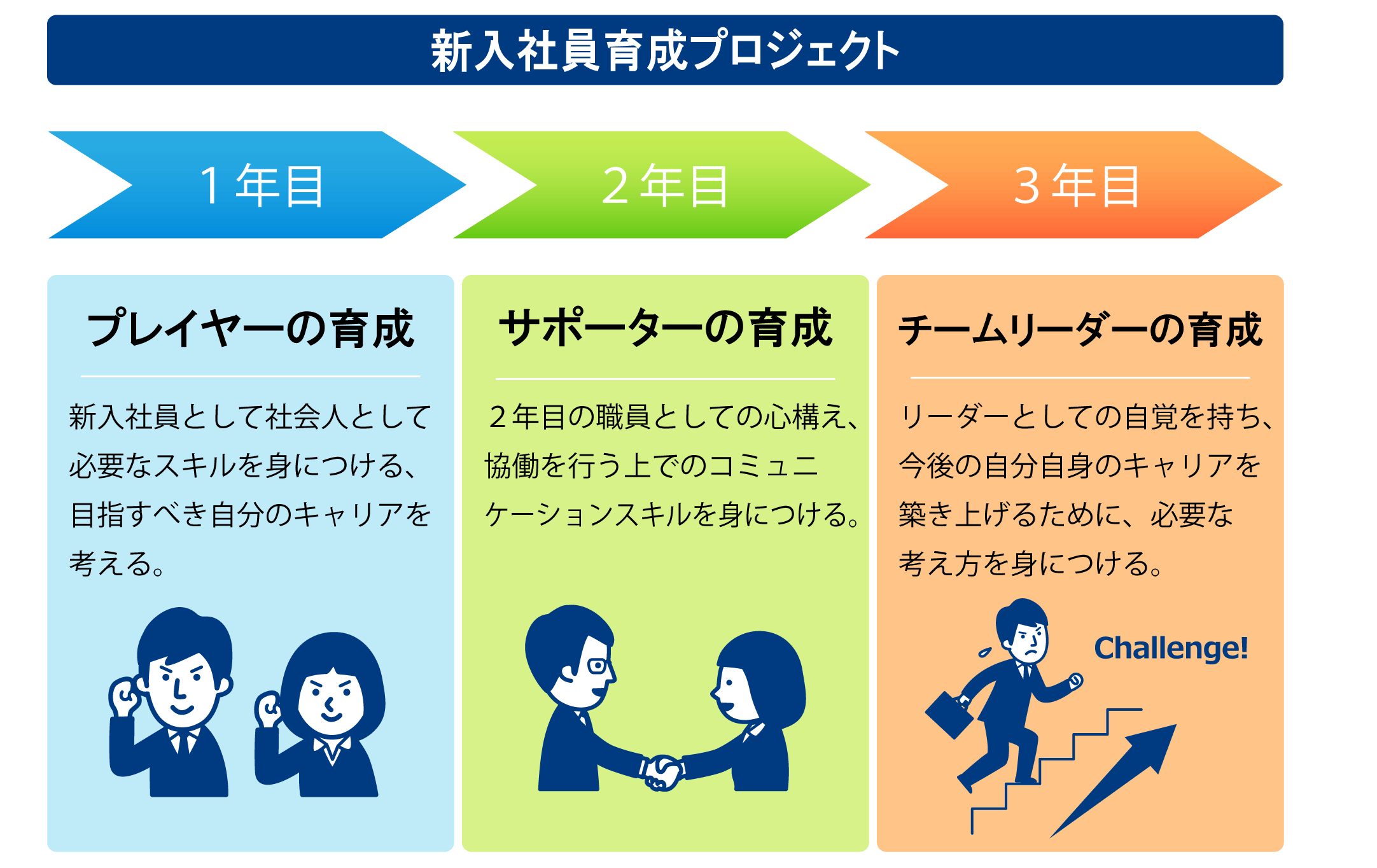 新人職員、指導担当者、管理者が一丸となって育成を行う3ヶ年プロジェクトです。